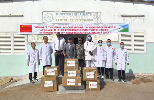 2025年12月15日,值世界强化免疫日之际,驻吉布提大使胡斌赴奥博克地区出席援吉第24批医疗队义诊暨小额医疗物资捐赠仪式,吉奥博克地区州长穆萨、地区议会主席默罕默德参加活动。