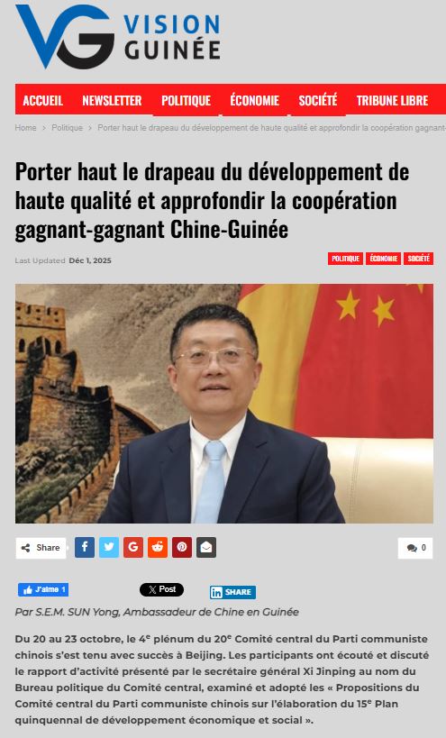 2025年12月1日,驻几内亚大使孙勇在几官方报纸《自由报》等当地主流媒体发表题为《高擎高质量发展旗帜 深耕中几互利共赢合作》的署名文章,宣介党的二十届四中全会精神,解读“十五五”规划建议重要意义,强调中几在两国元首战略引领和两国经济社会发展规划有力牵引下,将进一步深化中几命运共同体建设,推动两国友谊和互利共赢合作迈上新台阶。全文如下: