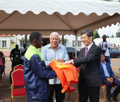 2025年9月24日,驻几内亚比绍大使杨仁火出席使馆向几比首都比绍市捐赠环卫物资交接仪式。比绍市长洛巴托等出席活动。