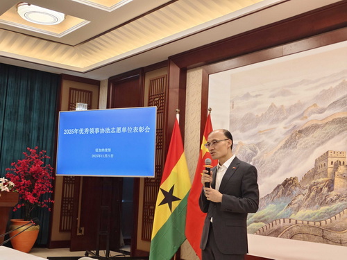 2025年11月21日,驻加纳大使童德发出席使馆举行的年度优秀领事协助志愿单位表彰会并致辞。40家单位近60名代表参加。