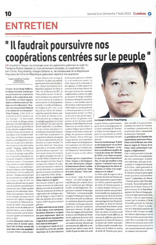 2022年8月6日,加蓬最大纸媒《团结报》刊发对驻加蓬使馆临时代办佟心平的专访。佟在专访中介绍了中加各领域友好合作,阐明中方对佩洛西窜访中国台湾地区的严正立场,驳斥“中国攫取非洲资源”、“中国新殖民主义”、“中国债务陷阱”、“中国压迫人权”以及关于世界粮食危机根源的谬论。采访内容如下: