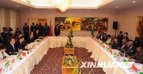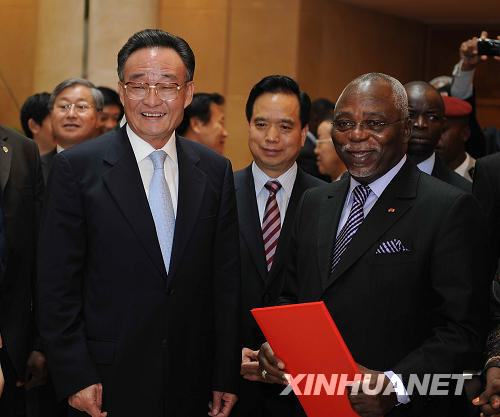 正在加蓬进行正式友好访问的全国人大常委会委员长吴邦国在利伯维尔与加蓬国民议会议长恩达马举行会谈