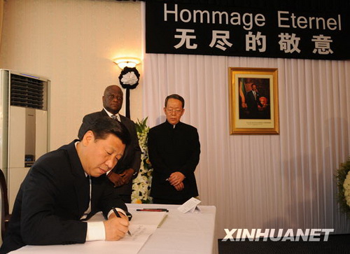 2009年6月12日,国家副主席习近平前往加蓬驻华使馆,代表中国政府吊唁加蓬总统哈吉奥马尔·邦戈·翁丁巴并敬献花圈。这是习近平在留言簿上题词,对邦戈总统的逝世表示沉痛哀悼。