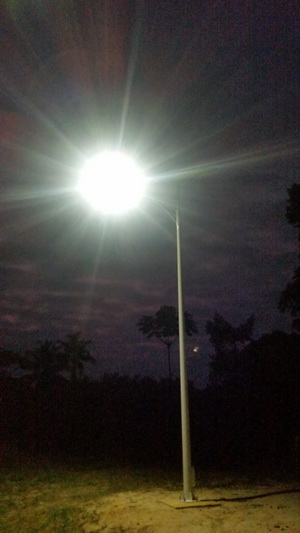 该项目共包括16套50w太阳能路灯,35套300w和5套720w太阳能户用系统,给沉寂的伊沃索村带来了光明,改善了当地百姓的生活和工作条件。从此以后,夜不再漆黑,因为家家户户里都泛出阑珊的灯光;从此以后,回家的路也不再孤寂,因为夹道相迎的路灯照亮空荡的田野,带领疲惫的归人回到温馨的家;从此以后,伊沃索村更不再闭塞,因为电力的供应为他们打开了通向外面世界的大门。这来自中国的光明,带着中加两国友谊的温暖,像夜空中的点点繁星,照亮了伊沃索村黑沉沉的夜,也照亮了伊沃索人走出封闭村落,翱翔外界天空的希望。