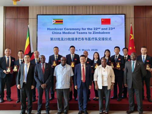 2026年3月5日,驻津巴布韦大使周鼎与津卫生和儿童福利部代理常秘尼亚马亚罗共同出席第22批与23批中国援津医疗队交接仪式。