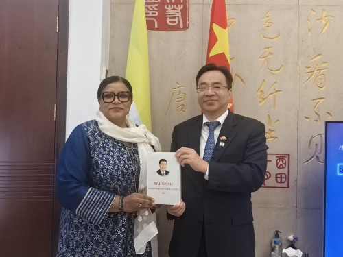 会见后,黄大使向雅斯敏赠阅《习近平谈治国理政》。