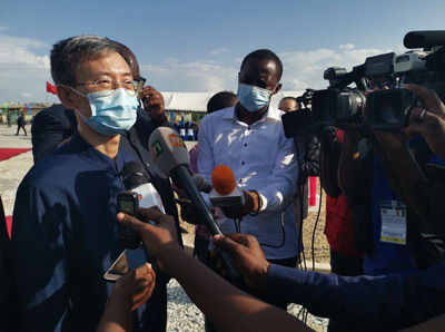 瓦塔拉总统、巴卡约科总理、万黎大使等共同为项目奠基,瓦塔拉总统并同万黎大使长时间握手,向中方表示感谢。万黎大使、查巴部长并分别接受科国家电视台等当地媒体采访。