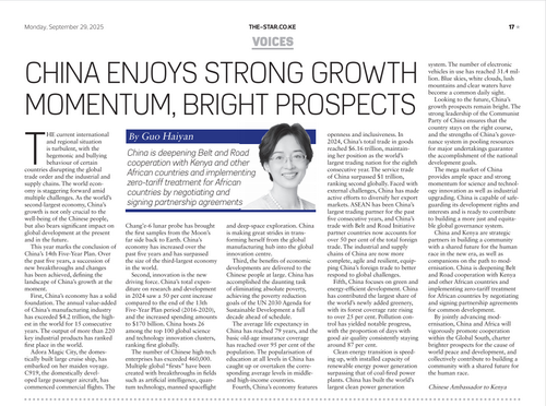 2025年9月29日,驻肯尼亚大使郭海燕在肯尼亚《星报》发表题为《中国发展势头强劲,前景光明》的署名文章。全文如下: