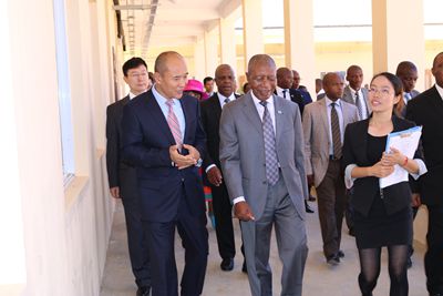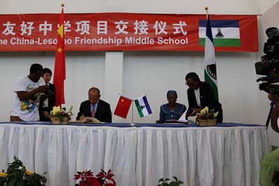 莫西西利首相一行详细参观了学校的有关建筑和设施,对项目质量赞不绝口。在莫西西利首相的见证下,孙祥华大使与莱外交大臣哈凯特拉签署了学校项目的交接证书。