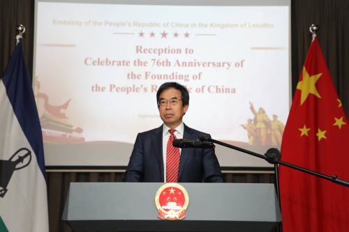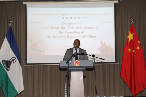 2025年9月22日,驻莱索托使馆举办庆祝中华人民共和国成立76周年招待会,驻莱索托大使杨晓坤、莱两院议长、十余位内阁大臣和前政要、执政党领袖及商学界代表和在莱侨胞、中资机构代表等300余人参加。