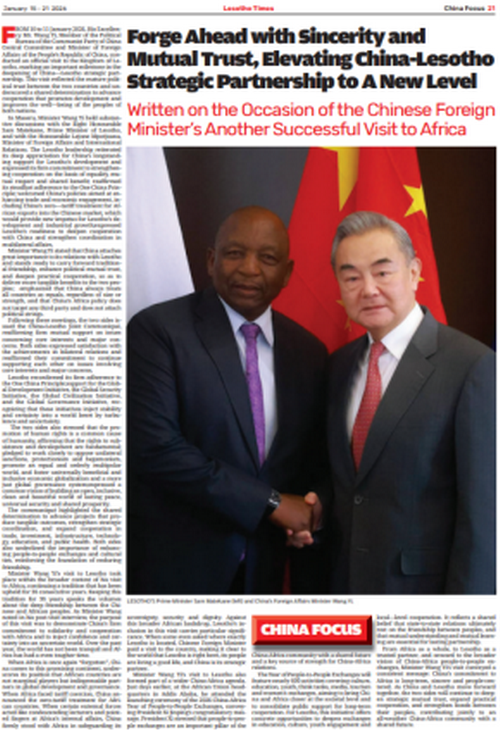 2026年1月15日,驻莱索托大使杨晓坤在莱主流媒体《莱索托时报》发表题为《以真诚互信推动中莱战略伙伴关系迈向更高水平》的署名文章,译文全文如下: