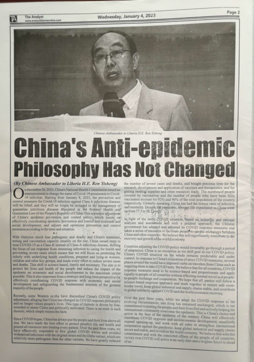 近日,驻利比里亚大使任义生在《每日观察家报》、《分析家报》、《问询者报》、《热辣报》、即时通讯社等多家利主流媒体发表题为《中国的抗疫理念没有发生变化》的署名文章,指出中国因时因势调整优化疫情防控政策,目的最大程度保障人民生命安全和身体健康,最大限度减少疫情对经济社会发展的影响,是高效统筹疫情防控和经济社会发展、维护最广大人民根本利益的战略、长远之举。全文如下: