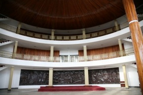精彩的讲座结束后,大家又随卡巴先生驱车前往议会参观。利比里亚“国会山”位于蒙罗维亚市中心,与总统府相对而立。议会大厦是一座呈对称结构的灰色建筑,参众两院各据一翼。夕阳斜照下的“国会山”,庄重威严。院内那手举“集结号”的女子铜像生动展现了号召国民参政议政、监督政府的议会精神。议会大厦门廊右侧伫立着杜伯曼总统的塑像。这位执政27年的总统仿佛正在试图说服议会什么。下班后的议会大厦内显得十分安静,但在卡巴先生绘声绘色的解说下,仿佛又重现了白日里议员们畅议国事的唇枪舌战和院外游说集团的人来人往……