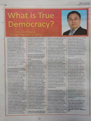 2021年12月9日,驻马拉维大使刘洪洋在马主流媒体《国民报》、《每日时报》发表署名文章《什么是真正的民主?》,全面深入阐释全过程人民民主的价值理念,强调中国的民主模式是真正的民主、管用的民主、成功的民主。全文如下: