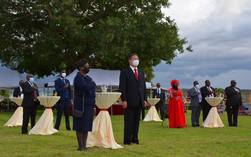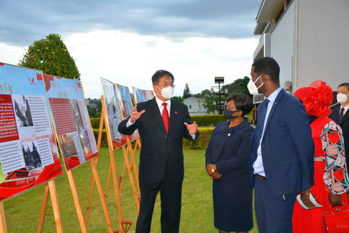 在刘大使的亲自讲解下,现场来宾观看了中国共产党成立100周年图片展。刘大使和哈拉议长并接受马国家广播电视台、《国民报》、《每日时报》等媒体采访。