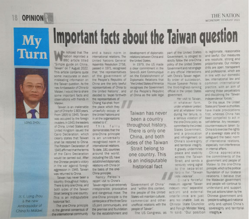 2022年8月10日,驻马拉维大使龙舟在马主流媒体《国民报》发表署名文章《关于台湾问题的若干重要事实》,对美西方近期涉台谬论予以批驳。