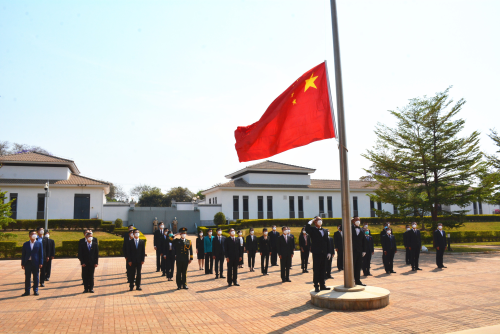 随着鲜艳的五星红旗冉冉升起,在场人员齐声高唱国歌,向国旗行注目礼,向伟大祖国致以崇高敬意和美好祝愿。