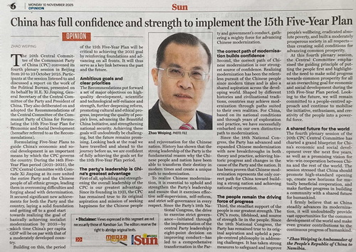 2025年11月10日,驻纳米比亚大使赵卫平在纳主流媒体《太阳报》发表题为《落实“十五五规划”,中国有定力、有信心、有底气》的署名文章,积极宣介党的二十届四中全会。赵大使强调,有中国共产党的全面领导、中国式现代化正确道路、人民的拥护和支持,中国必将完成好“十五五”时期经济社会发展各项目标。中国在接续推进现代化、促进和平与发展崇高事业的进程中,也必将为各国共同发展创造广阔机遇、为促进人类进步展现更大担当。