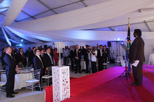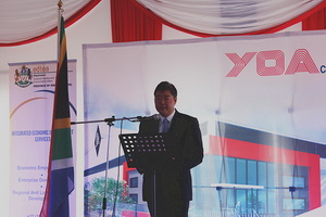 在现场播放中南两国国歌后,王建州总领事上台致词,代表中国驻德班总领馆对长飞光纤非洲控股有限公司的成立及投资合作项目落地德班领区杜贝贸易港表示热烈祝贺。他说,长飞公司在杜贝贸易港投资建厂是中方在夸纳省经济特区的首个大型投资项目,具有里程碑式意义,它是中南双方共同落实去年习近平主席访南和中非合作论坛约翰内斯堡峰会成果的具体体现。该项目符合夸纳省招商引资、积极建设杜贝贸易港经济特区的计划与愿景。中方积极鼓励和支持国内企业来非洲投资,以帮助非洲大陆加速工业化进程并提高自主发展能力。南非是中国对非投资及开展国际产能合作的主要目的地国之一。长飞公司是中国生产光纤光缆产品的大型国有企业,它具有雄厚的实力和先进的技术设备,产品远销各国,在国际市场同类产品中占有重要份额。该公司投资项目落地南非完全符合南非及夸纳省致力推进互联网基础设施建设和经济发展的实际需要,必将助力当地经济发展,造福当地人民。王总领事希望夸纳省政府、德班市政府、杜贝贸易港公司管理层及合作方能为长飞公司的经营发展创造良好环境,提供必要支持,将这一项目打造成中国在夸纳省投资的成功范例,以吸引更多中国企业来这里投资。