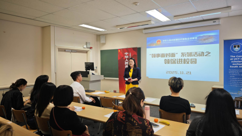 2025年11月21日,驻开普敦代总领事王晓率队赴南非开普敦大学开展“领事面对面—领保进校园”活动。来自开普敦大学、西开普大学、斯坦陵布什大学孔子学院的教师和志愿者及在当地学习的中国留学生等近30人参加。