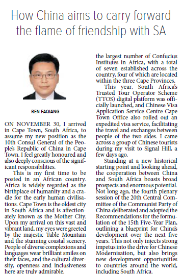 2025年12月12日,驻开普敦总领事任发强在南非主流媒体《开普时报》评论栏发表题为《赓续友好薪火 共启崭新征程》的署名文章。全文如下: