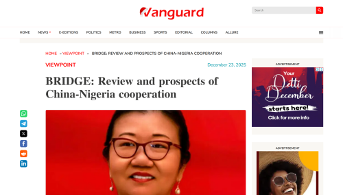 2025年12月22日至23日,驻拉各斯总领事严宇清在尼日利亚《先锋报》《今日报》《非中经济杂志》等当地主流媒体和《西非华文报》《西非华声报》《西非统一商报》等华文媒体发表题为《桥:中尼合作回顾与展望》的署名文章。全文如下:
