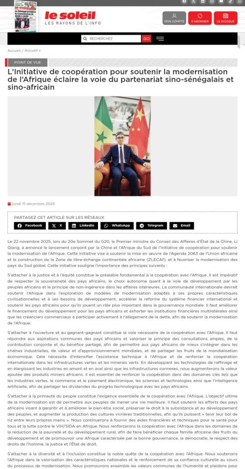2025年12月15日,驻塞内加尔大使李志刚在主流媒体《太阳报》、《南方日报》等媒体刊登题为《〈 支持非洲现代化合作倡议〉照亮中塞、中非前行之路》的署名文章,全文如下: