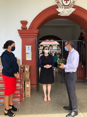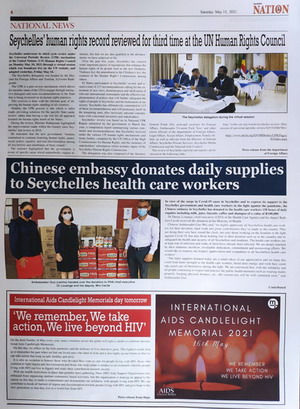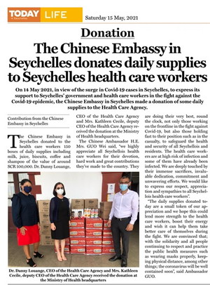 2021年5月14日,驻塞舌尔大使郭玮代表使馆向塞医护人员捐赠生活物资,塞卫生保健局首席执行官卢安日代表塞方接收。塞卫生保健局副首席执行官塞西尔等人出席。
