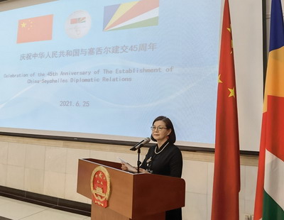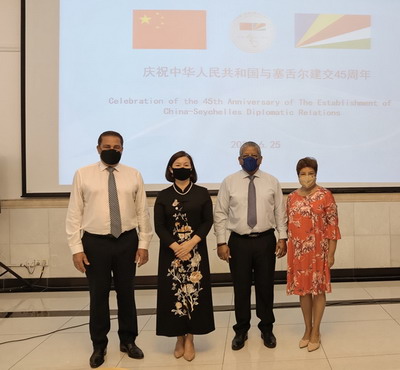 2021年6月25日,驻塞舌尔使馆隆重举办庆祝中国与塞舌尔建交45周年活动。塞总统拉姆卡拉旺偕夫人、副总统阿菲夫、议长曼西安纳、外交和旅游部长拉德贡德及多位内阁部长、国防军司令罗塞特、驻塞使节和当地华侨华人、援塞医疗队、孔子学院代表等出席。