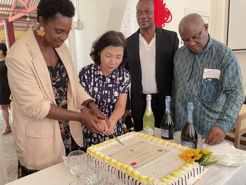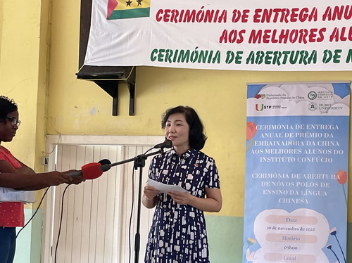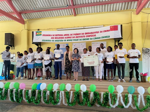 2022年11月30日,驻圣多美和普林西比大使徐迎真出席在圣普国家中学举行的“中国大使奖学金”颁奖仪式暨圣普大学孔子学院中学教学点启动仪式,圣普教育部长代表桑托斯、圣普大学校长达科斯塔、国家中学校长马尔塞洛、帕特里斯·卢蒙巴学校校长德塞塔、圣普大学孔子学院外方院长马加良斯、中方院长白梦璇及各校学生200余人参加活动。