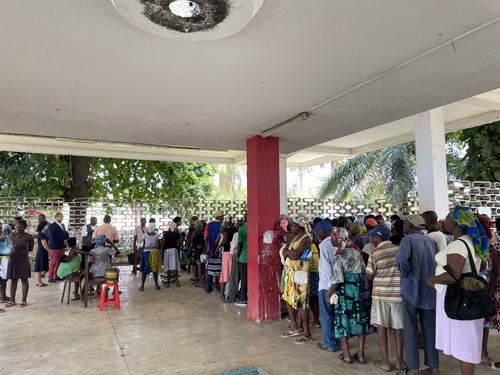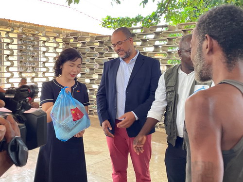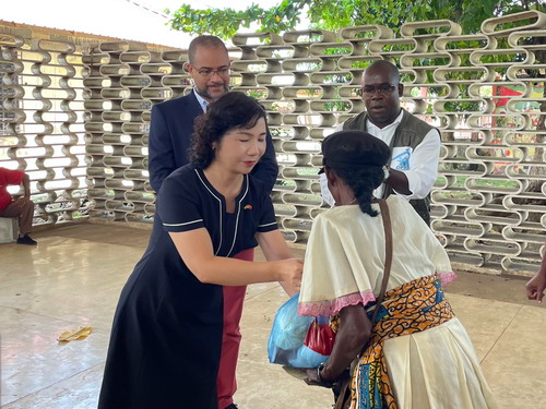 2022年12月20日,驻圣多美和普林西比大使徐迎真同圣普卫生、劳动和社会事务部长容凯拉在阿瓜格兰德大区人民公园共同出席驻圣普使馆向圣普贫困群体捐赠圣诞食品礼包仪式。
