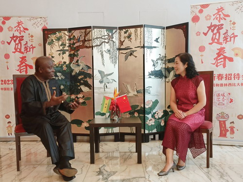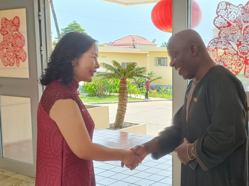 2023年1月27日,圣多美和普林西比外交、合作和海外侨民部长佩雷拉专程来使馆恭贺中国新春佳节。外长办公室主任马昆古陪同。驻圣多美和普林西比大使徐迎真感谢佩专程赴馆拜年,高度评价两国友好关系和务实合作,表示两国人民情同手足,中方一定会把外长所传递的圣普方的深厚情谊铭记于心,希望双方共同努力,在兔年不断深化两国友谊,使双边合作更具活力。