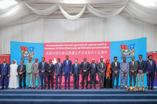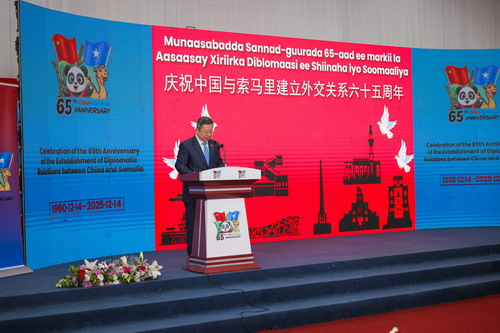 2025年12月16日,驻索马里使馆在摩加迪沙举行庆祝中索建交65周年招待会。驻索马里大使王昱和索总理巴雷、议会上院第二副议长赫尔西、外长德埃、防长菲基等领导人及高官,驻索使团和国际组织代表及友人200余人出席。