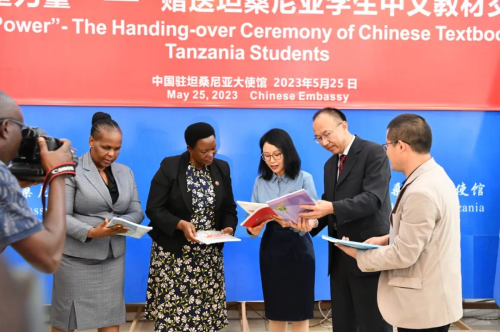 2023年5月25日,驻坦桑尼亚大使陈明健出席“知识就是力量——赠送坦桑尼亚学生中文教材交接仪式”,坦教育科学和技术部常秘卡罗琳·诺博、职教司司长尼尔·穆邦迪、教育学院总干事安尼斯·康巴等出席。