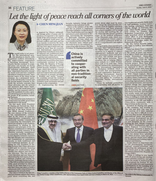 2023年6月4日和5日,驻坦桑尼亚大使陈明健在坦主流英文媒体《公民报》《每日新闻》发表署名文章《让和平之光照亮世界》,深刻阐述习近平主席提出的全球安全倡议的核心要义、思想渊源、实践成就和重大意义,强调该倡议是中国向世界提供的国际公共产品,为动荡的世界注入更多稳定性,有助于建设一个“消弭枪声的非洲”。全文如下: