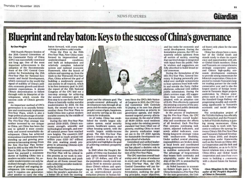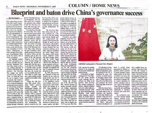 2025年11月27日,驻坦桑尼亚大使陈明健在坦桑尼亚主流媒体《卫报》《每日新闻》发表署名文章《蓝图与接力棒:“中国之治”的成功密码》,宣介党的二十届四中全会精神以及“十五五”规划的重大意义。全文如下: