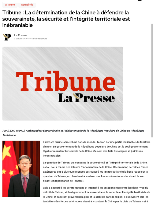 2026年1月3日,驻突尼斯大使万黎在突官方媒体《新闻报》官网发表题为《中国维护国家主权、安全和领土完整的意志坚定不移》的署名文章,就台湾问题阐明中方严正立场。全文如下:
