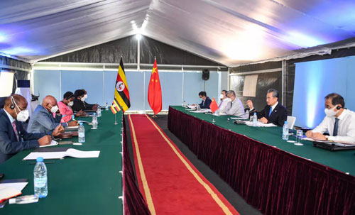 当地时间2021年11月29日,国务委员兼外长王毅在出席中非合作论坛第八届部长级会议期间在达喀尔会见乌干达外长奥东戈。
