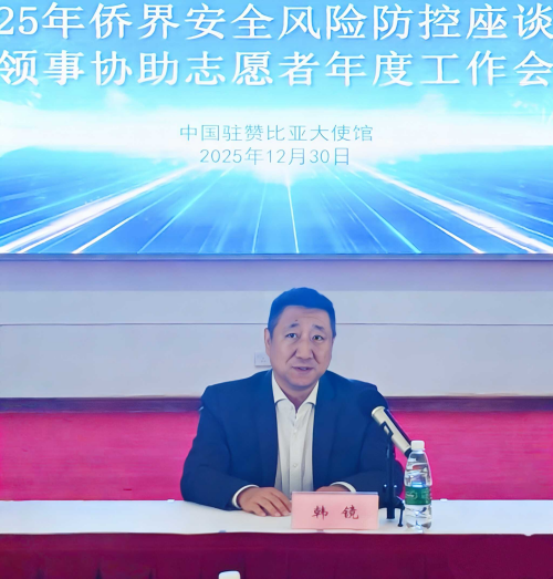 2025年12月30日,驻赞比亚使馆召开侨界安全风险防控座谈会暨领事协助志愿者工作会议。驻赞比亚大使韩镜、志愿者、侨界代表与会。