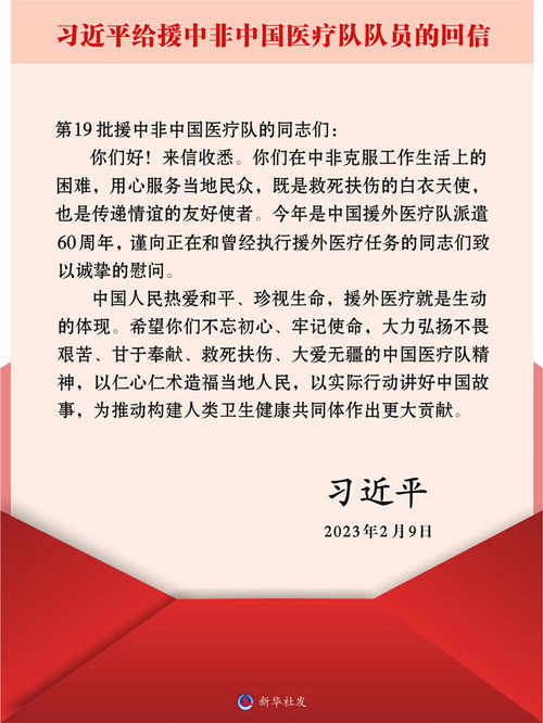 2023年2月9日——对于驻中非使馆和第19批援中非中国医疗队而言,这将是一个镌刻心头、终生铭记的日子。这一天,习近平总书记给第19批援中非中国医疗队全体队员回信了。