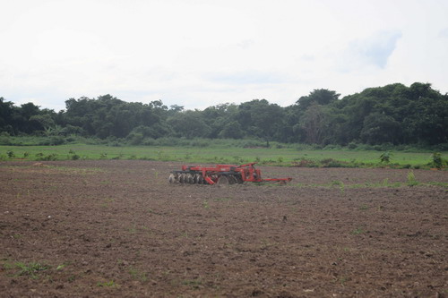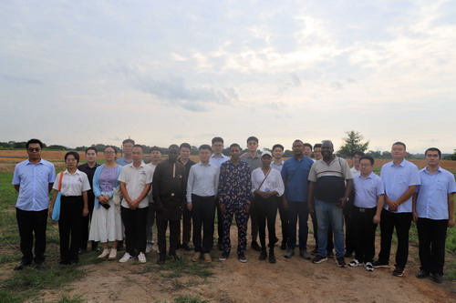 紧接着,大家来到了达马拉镇的百亩节水旱稻种植项目。这里既是伊瓦李斯特主席一家祖祖辈辈传下来的“口粮田”,也是他带领乡亲们引进中国先进农业技术试验良种的“致富田”。望着刚刚收稻正待插新秧的田地,他对大家介绍道,中非水稻栽培历史可追溯到公元6世纪,但水平一直极低,直到近年来中国水稻技术的引进才帮助农民们成倍地提升了产量。他深情捧起一抔土壤继续说道,尽管有进步,但离中国兄长的水平还差得比较远。今年我曾赴华参加过一期农业技术与减贫培训,现在我的目标是要让像湖南那样的万亩稻田项目在达马拉镇安家落户,让乌班吉河畔也能够“一条大河波浪宽 、风吹稻花香两岸”。