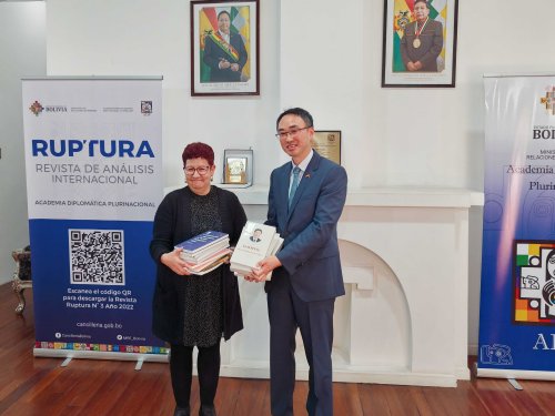 王大使并向玻外交学院赠送《习近平谈治国理政》等西班牙文版书籍。