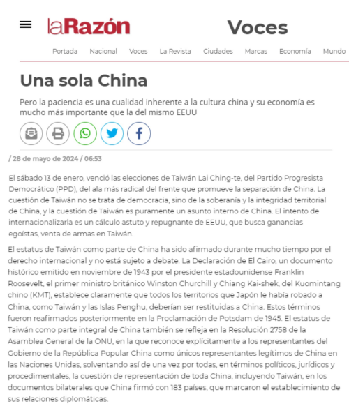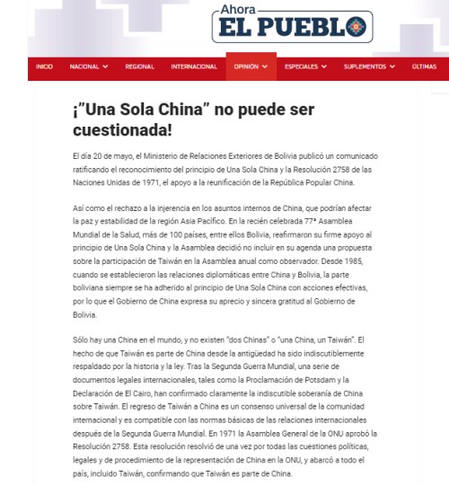 2024年5月29日,驻玻利维亚大使王亮在玻政府机关报《人民报》发表题为《一个中国不容挑战!》的署名文章,介绍第77届世界卫生大会拒绝涉台提案相关情况,强调联大第2758号决议的权威性和有效性不容置疑,同时批驳近期台湾地区领导人的谋“独”挑衅言论,并对玻政府长期坚定支持一个中国原则表示赞赏和感谢。