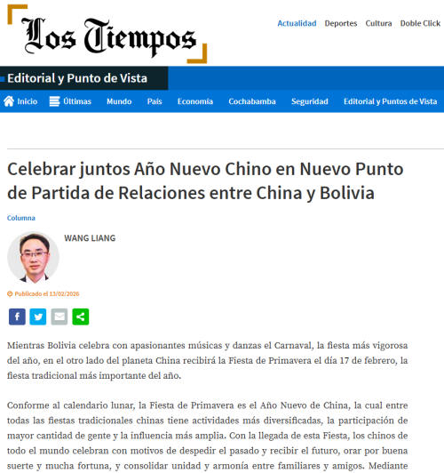 2026年2月16日,驻玻利维亚大使王亮在玻主流媒体《理性报》《日报》《时代报》发表题为《共庆中国年,中玻关系迎接新开端》的署名文章。