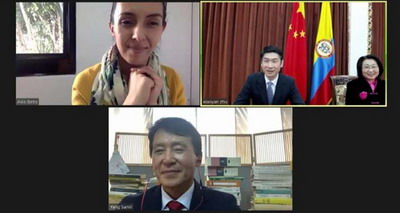 2020年10月20日,驻哥伦比亚大使蓝虎应邀与亚洲文化基金会主席萨米·杨举行视频会议,共同探讨后疫情时代推进亚洲文化在哥及拉美交流合作的远景及设想。
