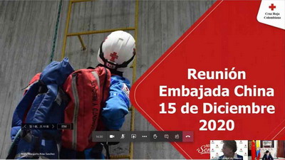 2020年12月15日,驻哥伦比亚大使蓝虎与哥伦比亚红十字会主席、美洲红十字会副主席卡瓦哈尔视频交流。
