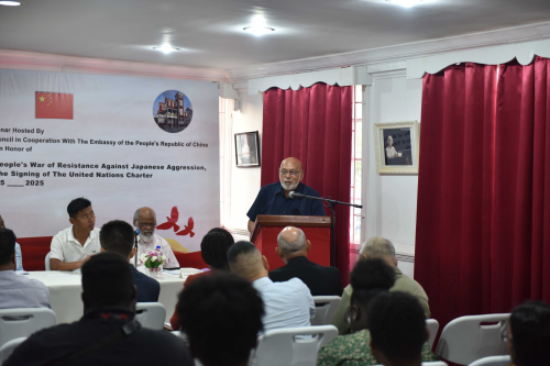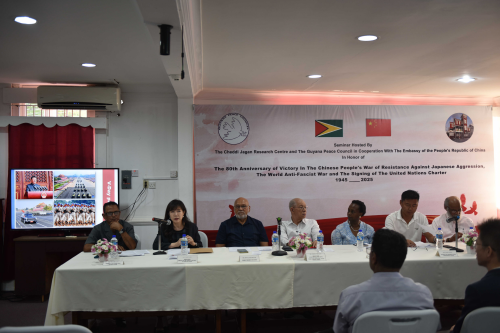 2025年9月24日,驻圭亚那使馆与圭和平理事会、契迪·贾根研究中心共同举办纪念中国人民抗日战争暨世界反法西斯战争胜利、联合国成立80周年研讨会。驻圭亚那大使杨扬、圭前总统拉莫塔、圭国防军前参谋长麦克林、联合国驻圭协调员卡莫等发言,侨团及圭方代表参加。