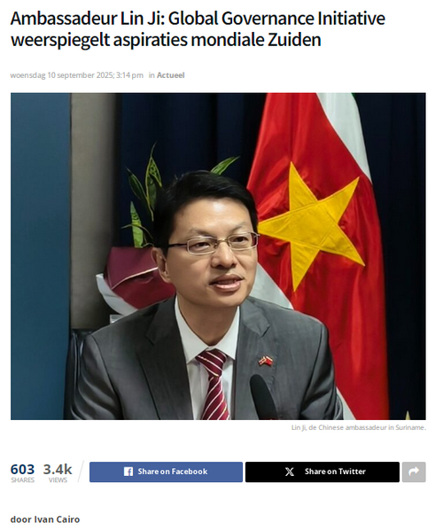 2025年9月10日,驻苏里南大使林棘在苏里南主流媒体《真理时报》发表署名文章《全球治理倡议符合全球南方国家共同期待》,全文如下: