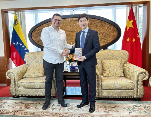 2023年5月29日,驻委内瑞拉大使蓝虎会见委执政党统一社会主义党机关报《4F报》社长比亚波尔。