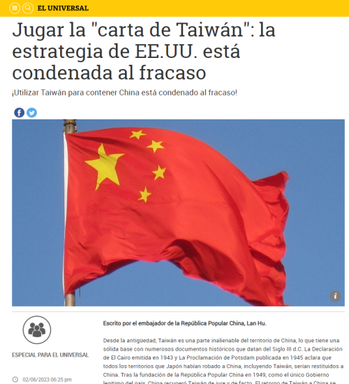 2023年6月2日,委内瑞拉主流媒体《宇宙报》全文刊登驻委内瑞拉大使蓝虎署名文章《美国“以台制华”终将一败涂地》。中文全文如下: